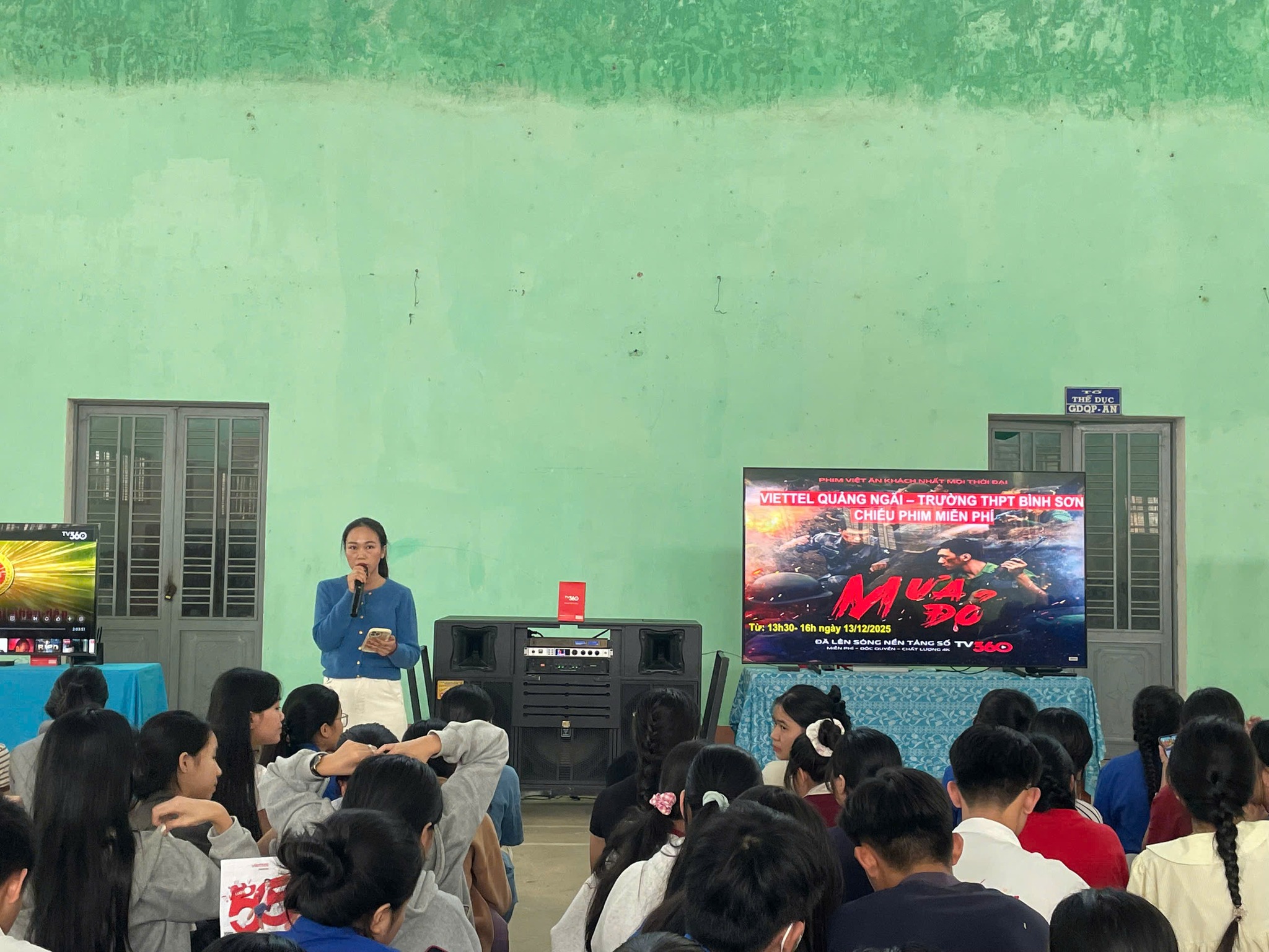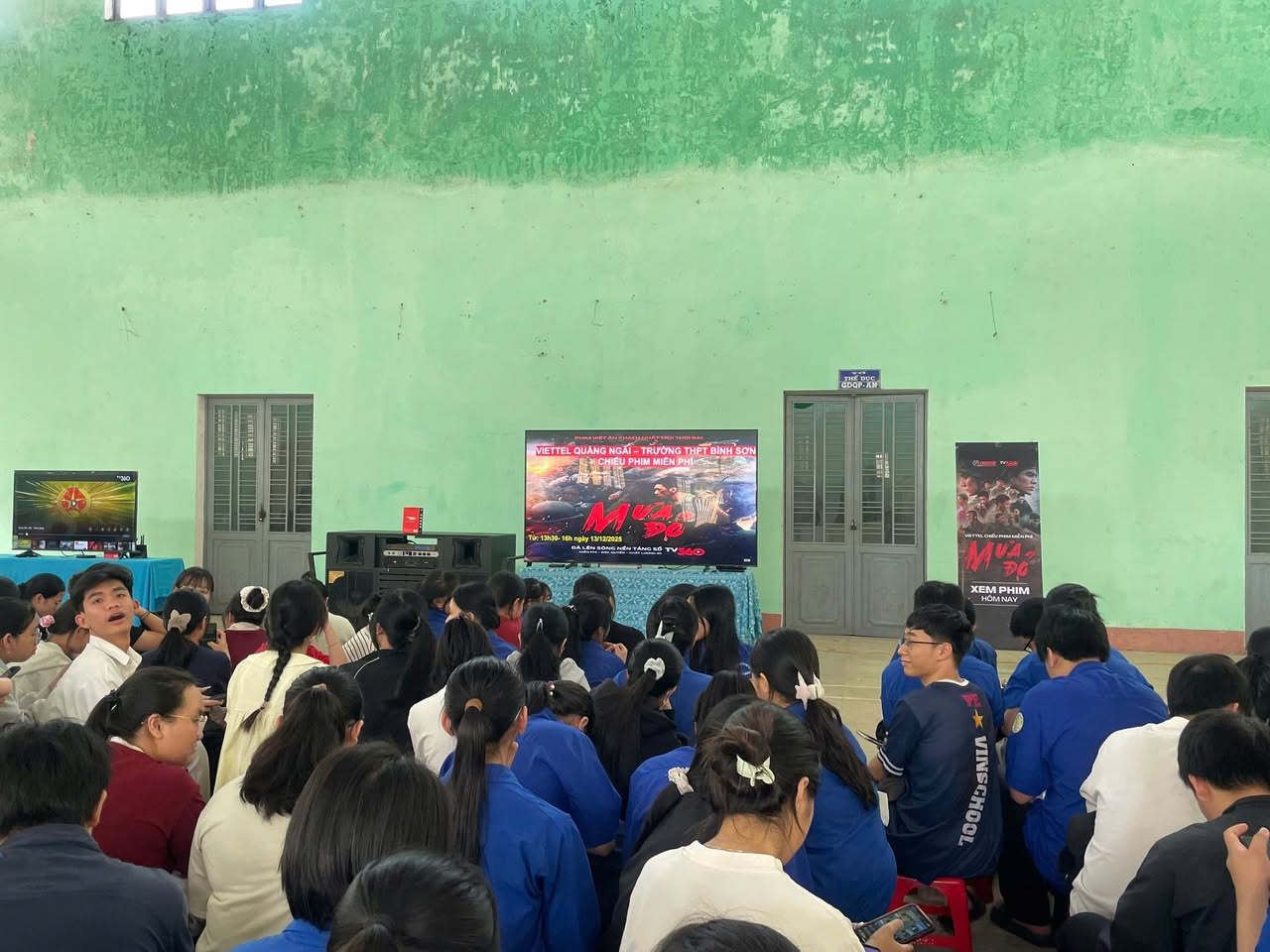 Chiều thứ Bảy, ngày 13/12/2025, Trường THPT Bình Sơn phối hợp với Viettel Quảng Ngãi tổ chức buổi chiếu phim Mưa đỏ dành cho học sinh toàn trường. Hoạt động được tổ chức nhằm hướng tới kỷ niệm 81 năm Ngày thành lập Quân đội Nhân dân Việt Nam (22/12/1944 – 22/12/2025).