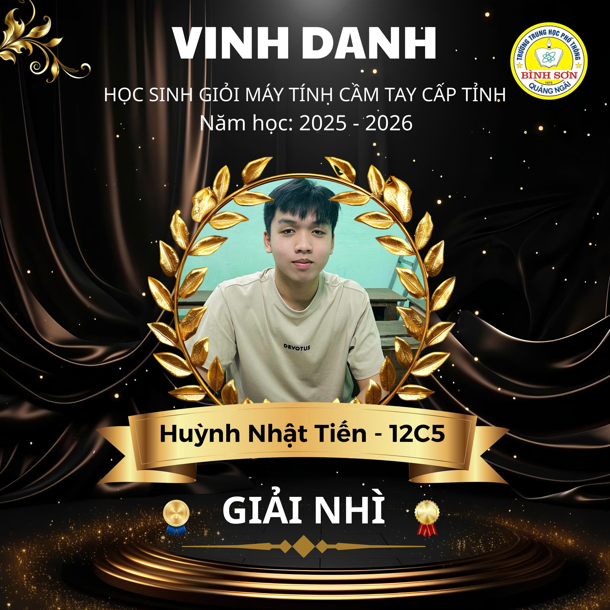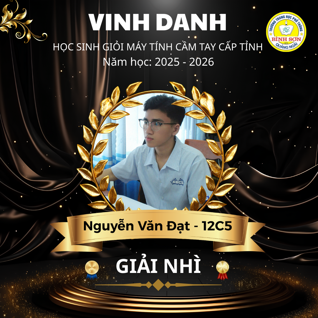 Ngày 11/12/2025, Sở Giáo dục và Đào tạo Quảng Ngãi đã công bố kết quả Cuộc thi chọn Học sinh giỏi Giải Toán trên máy tính cầm tay dành cho học sinh trung học cấp tỉnh, năm học 2025 – 2026. Tham gia kỳ thi với tinh thần nghiêm túc và quyết tâm cao, Trường THPT Bình Sơn vinh dự có 02 học sinh xuất sắc đạt giải Nhì: